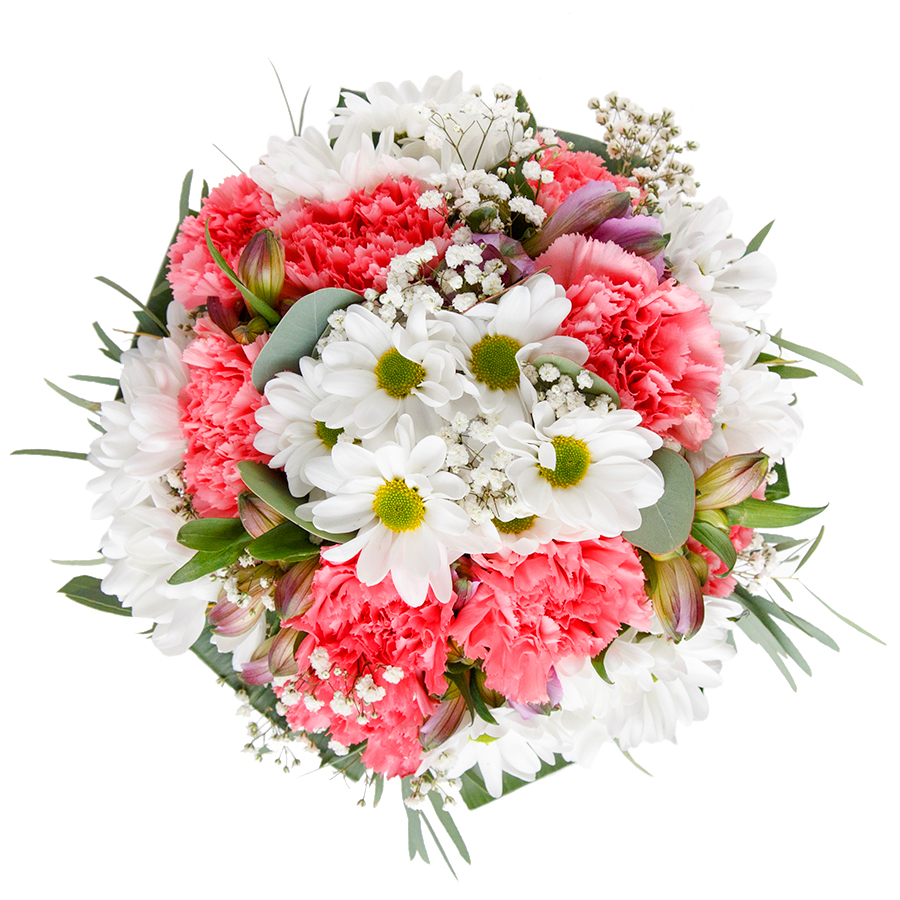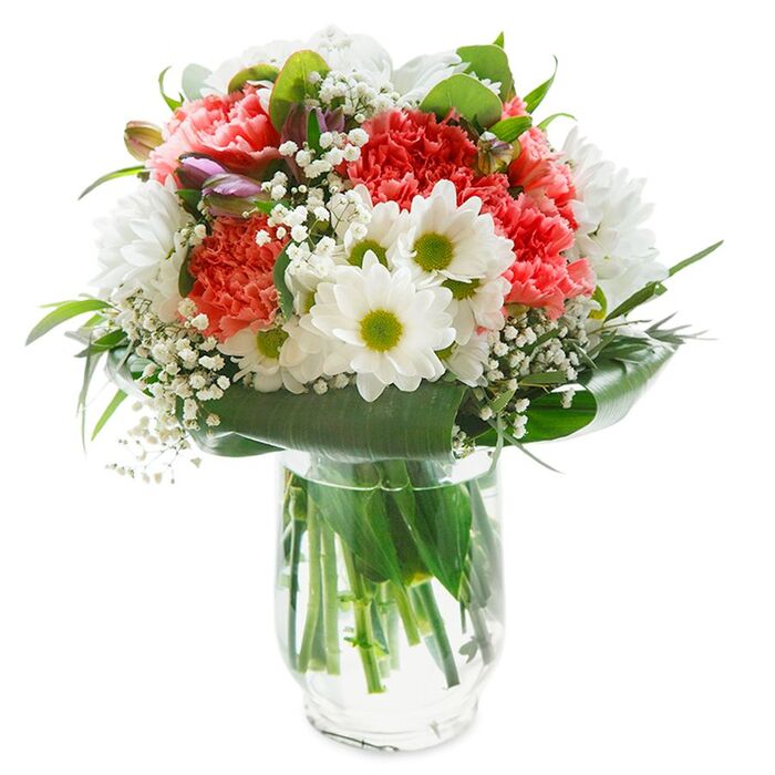 Delight someone special with our beautiful and unique floral arrangement. This bouquet features a harmonious blend of snow-white chrysanthemums, airy gypsophila, and light pink carnations, elegantly wrapped in lush aspidistra leaves.